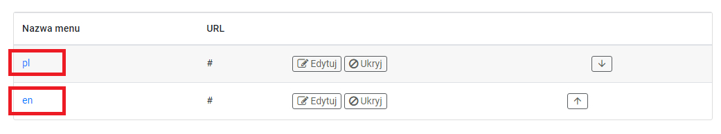 6. Dodany element menu pojawi się na stronie po kliknięciu w przycisk Pokaż. Element można też tymczasowo ukryć na stronie klikając przycisk Ukryj.