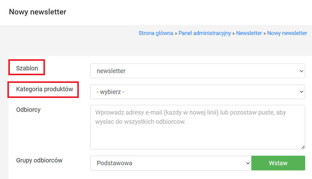 - Szablon własny "newsletter" - umożliwia wstawienie własnego szablonu.