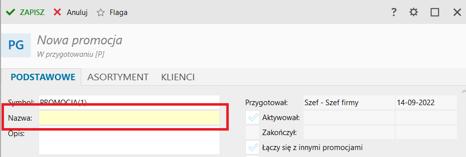 2. W zakładce "Podstawowe" uzupelnij nazwę promocji i wybierz termin w jakim ma ona obowiązywać. Wpisz również wartość procentową rabatu.